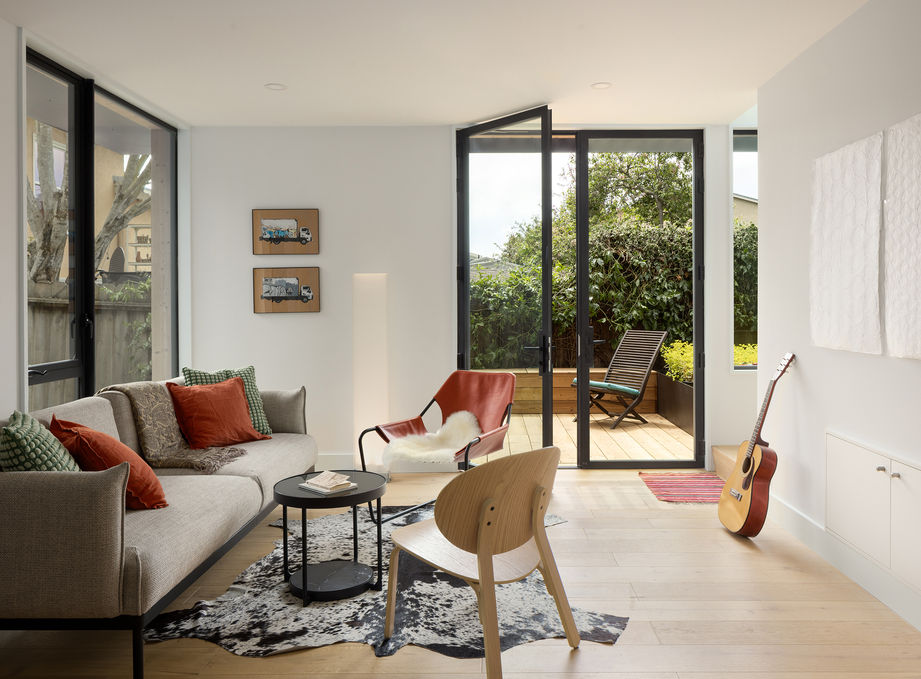 This compact accessory dwelling unit in East Bay was designed as part of a long-term vision for multigenerational living. The homeowner plans to retire into the ADU while their adult children move into the main house—creating a flexible, connected family compound that evolves with changing needs. Set at the rear of the lot, the 800 SF structure is modest in size but designed to feel expansive, with large windows, high ceilings, and a strong indoor-outdoor connection. Clad in thermally modified wood and steel, the exterior balances warmth and durability, while the interior prioritizes natural light, privacy, and simplicity. The result is a quiet, dignified retreat with thoughtful detailing and craftsmanship throughout. A small space that supports a big shift in how a home can function over time.